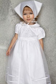 Белоснежное крестильное платье для девочки Торжество Fleole из хлопка. Нежный фатин, нашитый по бокам платья, придает наряду легкость и воздушность. Платье легко одевается и застегивается сзади на 3 пуговки. Минимальная сумма заказа 1500 руб. Возможен самовывоз. Есть доставка.