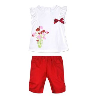 Комплект (блуза + бриджи) Lebe выполнен из натурального хлопка. Блуза с рукавами-крылышками и кнопками застёжками по спинке декорирована цветочным принтом и небольшим бантиком. Бриджи с поясом на резинке и сборочкой на брючинах, карманы ложные. Внимание! Фактический цвет изделия может незначительно отличаться от цвета на фотографии в связи с особенностями цветопередачи различных цифровых устройств. None