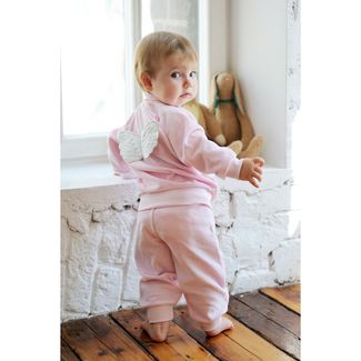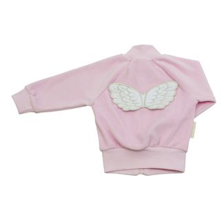 Велюровая курточка без капюшона на молнии с защитой подбородка. Ворот и манжеты выполнены из трикотажной резинки. Спереди изящный серебряный принт, спинка куртки украшена аппликацией в виде ангельских крылышек. Аппликация выполнена из двух слоёв белого хлопкового трикотажного полотна и тонкого уплотнителя, отстрочена нитью серебренного цвета. None Можно купить без предварительного заказа.