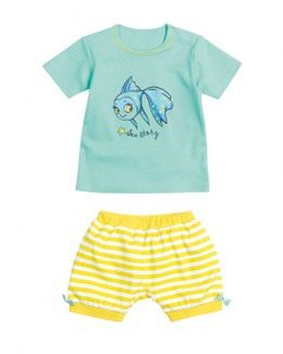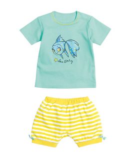 Комплект для девочки футболка и шорты Emerald Пеликан сделан из мягкого хлопка. Топ с принтом рыбки, кнопками и контрастной отстрочкой по горловине. Шорты присобраны и украшены бантиками, сзади надпись. Минимальная сумма заказа 1500 руб. Возможен самовывоз. Есть доставка.