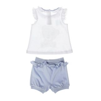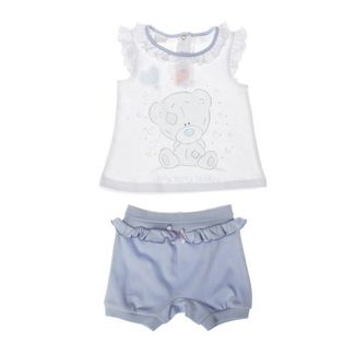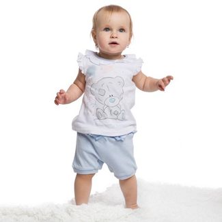 Комплект из майки и шорт. Майка украшена водным принтом, глиттером и стразами. Отрезная кокетка на рукавах. Застежки-кнопки на плече. Украшена принтом с мишкой Тедди. Пояс и низ шорт на резинке, их удобно надевать на подгузник. Украшены бантиком. None Можно купить без предварительного заказа.