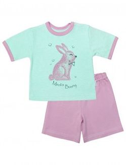 Комплект Веселый малыш Мятный зайка состоит из футболки с коротким рукавом и шортиков. Воротник футболочки застегивается на кнопку, а на шортиках крепкая, но не давящая на животик резинка. Покрой шорт позволяет одевать под них подгузник. Минимальная сумма заказа 1500 руб. Возможен самовывоз. Есть доставка.