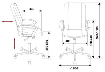 <br> Крестовина выполнена из металла. Обивка — перфорированная искусственная кожа. Высота кресла регулируется за счет газлифта.<br> Габариты сиденья (ШхГ): 480 х 430 мм.<br /> Диапазон высоты от пола до сиденья: 450-560 мм.<br /> Диапазон высоты от пола до верхнего края подлокотников: 630-740 мм.<br /> Диаметр крестовины: 650 мм. None Страна производства: Россия
