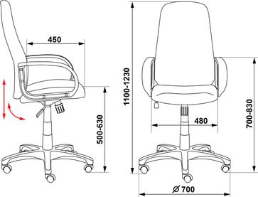 Характеристики: <br> Материал крестовины и подлокотников: пластик.<br> Материал обивки: ткань.<br> Размер сиденья (ШхГ): 480 х 450 мм.<br> Диапазон высоты от пола до сиденья: 500-630 мм.<br> Диапазон высоты от пола до верхней части подлокотников: 700-830 мм.<br> Диаметр крестовины: 700 мм.<br> Максимальная нагрузка: 120 кг.<br> None Страна производства: Россия