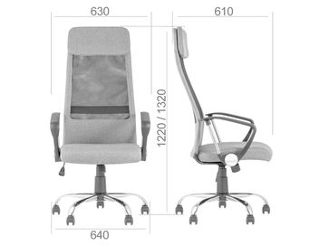 Характеристики: <br> Материал крестовины: хромированный металл.<br> Диаметр крестовины: 640 мм.<br> Материал подлокотников и колес: пластик.<br> Механизм регулировки высоты: газлифт.<br> Механизм качания: с фиксацией в вертикальном положении.<br> Регулируемая высота сиденья: 410-510 мм.<br> Габариты сиденья (ШхГ): 490 х 480 мм.<br> Максимальная нагрузка: 120 кг.<br> None Страна производства: Китай