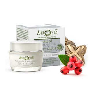 С молоком ослиц, гиалуроновой кислотой и экстрактом морских водорослей. Эффективный восстанавливающий ночной уход, который омолаживает кожу и устраняет вредные воздействия окружающей среды. Инновационный восстанавливающий крем для обеспечения максимальной защиты и эффективного омолаживающего ухода на основе критского оливкового масла и молока ослиц. Работает не только во время бодрствования, но и в период сна. Ночной крем способствует регенерации и замедлению процесса старения кожи. Уникальная формула ночного комплекса богата ценными маслами инка инчи, авокадо, арганы, шиповника, дерева ши, которые глубоко питают и борются со свободными радикалами, возвращают коже молодость и сияние. Экстракты граната, красных и бурых водорослей, пептиды моринга, гиалуроновая кислота, витамин E и провитамин B5 - защищают, увлажняют и восстанавливают кожный покров, предотвращают появление морщин. Согласитесь, приятно встретить новый день помолодевшей и посвежевшей! Косметика Aphrodite из натуральных компонентов не содержит парабенов, искусcтвенных красителей и животных жиров. Активные компоненты: органическое оливковое масло, молоко ослиц, масло авокадо, масло арганы, масло инка- инчи, масло шиповника, экстракт граната, пептиды моринга, масло дерева ши, стволовые клетки хлопка, гиалуроновая кислота с низким молекулярным весом, поперечносшитая гиалуроновая кислота, экстракт морских водорослей, витамин Е, провитамин В5 Способ применения: Вечером равномерно легкими массажными движениями нанесите небольшое количество крема на предварительно очищенную кожу лица. Рекомендуем использовать в сочетании с омолаживающим защитным дневным кремом для лица. Доставка по всей РФ, Boxberry, DPD, Почта Возможен самовывоз. Есть доставка.