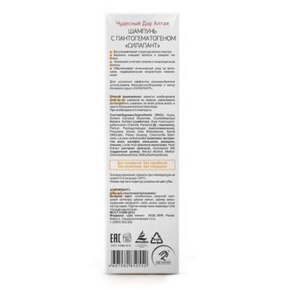 Шампунь с пантогематогеном восстанавливает структуру волос изнутри, бережно очищает волосы и придает им блеск. Увлажняет и питает ломкие и поврежденные волосы. Обеспечивает интенсивный уход за волосами, подверженными возрастным изменениям Активные компоненты: сорбитол, Д-пантенол, пантогематоген, комплекс экстрактов алоэ, шалфея, женьшеня, ромашки, левзеи, кислота молочная, экстракт жемчуга, гидролизат шелка. Способ применения: Нанести необходимое количество шампуня на ладони, равномерно распределить шампунь по всей длине волос и смыть большим количеством воды. При необходимости повторить Бальзам-кондиционер для волос с пантогематогеном укрепляет кончики волос, восстанавливает поврежденную структуру. Нормализует обменные процессы, питает и укрепляет корни волос. Делает волосы более мягкими, объемными и шелковистыми. Улучшает расчесывание, защищает волосы при горячих укладках Бальзам-кондиционер - отличное дополнение к шампуню! Активные компоненты: Д-пантенол, пантогематоген, экстракты хмеля, ромашки, подорожника, зверобоя, анютиных глазок, липы, крапивы, хвоща, лопуха. Способ применения: небольшое количество бальзама нанести на влажные чистые волосы, оставить на 2-3 минуты и смыть теплой водой. Маска для волос с пантогематогеном увлажняет, смягчает волосы, укрепляет кончики волос. Питает волосы по всей длине, восстанавливает поврежденную структуру. Придает волосам мягкость, шелковистость и объем, не утяжеляет их. Обеспечивает легкость расчесывания, защищает волосы при горячих укладках Активные компоненты: сорбитол, касторовое масло, кислота молочная, Д – пантенол, гидролизованный кератин, экстракт жемчуга, гидролизат шёлка, экстракты арники, берёзы, зелёного чая, крапивы, ромашки, шалфея, дрожжей пивных, пантогематоген. Способ применения: небольшое количество маски нанести на влажные чистые волосы, оставить на 5 - 10 мину