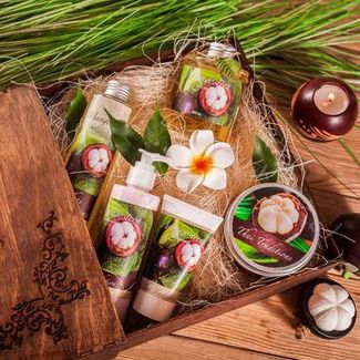 Роскошный набор косметики с ароматом свежего мангостина в стильной и красивой подарочной коробке из дерева! В набор входят: