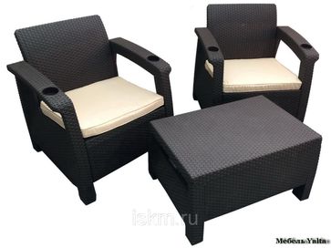 Комплект плетеной мебели Yalta Balcony Set Два кресла и столик. Цвет: венге, подушки бежевые. Размеры: кресло 757079 см; стол 775742 см Мебель Yalta - это отечественный аналог плетеной мебели известных европейских марок. Вся пластиковая мебель этой марки имеет стильный современный внешний вид. Отличительная черта - быстрая, интуитивно понятная сборка. В разобранном состоянии занимает мало места. Комплекты уличной мебели Yalta обладают эргономичными подлокотниками, в которых имеются отверстия для стаканов. Просты в эксплуатации и уходе.