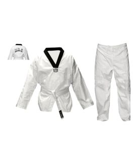 Кимоно тхэквондо (черный ворот) - это кимоно для занятий тхэквондо из смешанной ткани (40% полиэстера и 60% хлопка), которая легче стирается и гладится, лучше держит форму, улучшает визуальное восприятие спортсмена.Основные характеристики:Пол: унисексРазмеры, см: 120, 130, 140, 150, 160, 170Цвет: белый, черныйДополнительные характеристики:Комплектация: куртка, брюки, поясМатериал: поликоттон, 60% хлопок, 40% полиэстерПроизводство: ПакистанОсобенности: хорошо и легко гладится и стираетсяотлично держит формуВнимание! Пояс белого цвета, черный только воротник. None