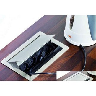 • Крышка выполнена из высококачественной стали • Корпус из анодированного алюминия серебристого цвета • 3 электрические розетки с заземлением 16 A 220 В из пластика чёрного цвета • Длина кабеля 3 м • Толщина столешницы от до 50 мм • Штепсельная вилка идёт в комплекте, но не соединена с кабелем • Размеры выреза под блок : 245 х 157 мм