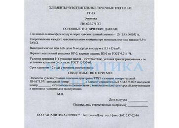 Продаются парами, один элемент сравнительный 5В4.675.072 и один измерительный 5В4.675.071. Технические характеристики ТТЧЭ-2 УХЛ4Ток накала в атмосфере воздуха через чувствительный элемент (0,165 ± 0,005) АСопротивление каждого чувствительного элемента при номинальном токе накала (9,9 ± 0,6)Выходной сигнал при I об. доле % водорода в воздухе (115 ± I5) mVСрок хранения 2 года с момента изготовления Чувствительный элемент ТТЧЭ-2УХЛ4 к ГТХ-1М.