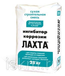 Предлагаем купить ингибитор коррозии ЛАХТА® Доставка в любой город Однокомпонентный цементный состав для защиты стальной арматуры от коррозии. Область применения ЛАХТА ингибитор коррозии железа используется в качестве антикоррозийного покрытия для стальной арматуры: для защиты стальной арматуры от коррозии при ремонте и новом строительстве; в случае, если нет возможности быстро закрыть оголённую арматуру ремонтным составом или бетоном; для предотвращения хлоридной коррозии арматуры. Описание материала ЛАХТА ингибитор коррозии — сухая строительная смесь белого цвета на цементном вяжущем с активными химическими компонентами и модификаторами. Преимущества надежно защищает арматуру от коррозии; имеет светлый цвет, что позволяет контролировать необработанные участки; используется в качестве адгезионного слоя; имеет высокую прочность сцепления c бетоном и стальной арматурой; быстро схватывается, что позволяет уменьшить технологическую паузу перед нанесением второго слоя. Ограничения не рекомендуется наносить состав на ржавую арматуру без предварительной подготовки; нельзя наносить состав на замасленную и пылящую поверхность.