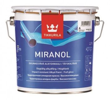 TIKKURILA МИРАНОЛ (Тиккурила Миранол) является алкидной краской универсального применения. Эмаль можно использовать при окраске мебели, лодок и велосипедов, рекламных вывесок, рабочих инструментов. Тиксотропная краска – вязкая и густая в состоянии покоя, легко наноситься не оставляет следов от малярных инструментов, гарантирует равномерное окрашивание. Окрашенные эмалью поверхности имеют красивый внешний вид, отличаются долговечностью и прочностью, сохраняют свои показатели в условиях повышенной атмосферной нагрузки, что позволяет использовать для окрашивания различных поверхностей внутри и вне помещений. Великолепно скрывает мелкие дефекты поверхности, износостойка во время эксплуатации, ударопрочная.