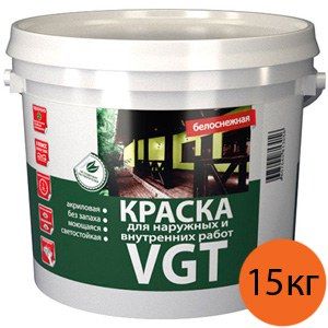 - ВГТ краска для наружных и внутренних работ белоснежная (15кг) VGT краска для наружных и внутренних работ акриловая моющаяся матовая ВД-АК-1180 (15кг) по выгодной цене 828 р. руб.;