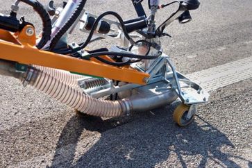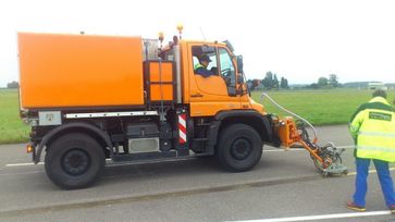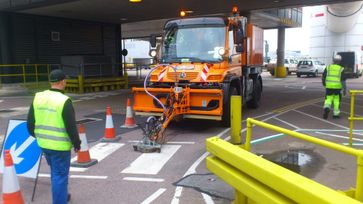 Водоструйный демаркировщик высокого давления на шасси Unimog. Производство фирмы Weigel PeelJet (Winter/Gruen) Германия. Давление воды 2500 бар. Вакуумная уборка отходов. После работы машины остаётся только мокрый след от воды, как будто асфальт помыли. Возможно удаление продольной и поперечной разметки, а также удаление следов резины с покрытия взлётно-посадочных полос в аэропортах.
