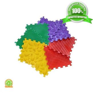 Страна-изготовитель: Россия"Для грамотного и разностороннего развития малыша! Коврик ортопедический модульный ТМ «ОРТО ПАЗЛ»- МИКС «Универсальный» Поверхности ковриков имитируют разные элементы: горку, лесные шишки, траву на холмике и ежиков. Во время ходьбы по ним малыш получит улучшение функций стопы, сократится нагрузка на позвоночник и суставы ног, укрепится мышечно-связочный аппарат и улучшится общее состояние организма. Массажные поверхности обладают мощным расслабляющим действием и снимают синдром хронической усталости. Благодаря воздействию на активные точки, осуществляется массаж внутренних органов. Этот удивительный коврик подарит море положительных эмоций вашему ребенку. Но главное – он развивает мелкую моторику, мышление и цветовосприятие. Тренирует вестибулярный аппарат, способствует развитию мышц стопы и голени, улучшает кровообращение голеностопного сустава, препятствует развитию ассиметричной ходьбы, уменьшает риск развития плоскостопия. Также доказано, что коврик обладает тонизирующим воздействием на организм. Перечислять полезные функции коврика можно очень долго, потому гораздо проще его купить, чтобы приступить к всестороннему развитию чада. Думаете, что ваш маленький привереда не захочет играть с данным изделием? Вы заблуждаетесь! В комплекте малыш найдет такие модули, которые точно вызовут у него положительные эмоции. Коврик не останется без внимания и будет использоваться очень часто. Яркая конструкция пригодится не только для веселых игр, но и защитит непоседу от любых ударов или падений. В комплект входят следующие модули (по 2 экземпляра каждого типа): Жесткая трава зеленого цвета, способствующая образованию здорового подъема свода; Жесткие шипы красного цвета, позволяющие точечно проработать всю поверхность стопы ребенка и оказать благоприятное воздействие на внутренние органы; Жесткие шишки желтого цвета, усиливающие давление на стопу и увеличивающие эффективность тр