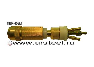 Плазмотрон ПВР-402М предназначен для механизированной воздушно-плазменной резки черных металлов и нержавеющей стали толщиной до 100 мм, алюминия и его сплавов толщиной до 100 мм, меди и ее сплавов толщиной до 80 мм. Плазматрон ПВР-402 применяется в установках воздушно-плазменной резки металлов типа, УПР-4010, УПР4011, УПР-4011-1 и может быть использован в комплекте с аппаратами воздушно-плазменной резки металлов [АПР-403, АПР-404, АПР-404М, КИЕВ-4М] или с иными обеспечивающими необходимые параметры зажигания дуги и внешние характеристики. Расходные материалы к этому плазмотрону: сопло СП-03 для воздушно-плазменной резки; катод электрод ЭП-03 для воздушно-плазменной резки. ПВР-402М плазмотрон может быть установлен на любом механизме, обеспечивающем равномерное перемещение, например, на машинах для термической резки металлов по ГОСТ 5614. Плазматрон можно использовать для снятия фасок под углом 45°. Плазмотрон имеет одинаковый с плазмотроном ПВР-180 узел крепления, что позволяет, не меняя подводящих коммуникаций и оперативно переходить от резки на ПВР 180 к работе на ПВР-402М