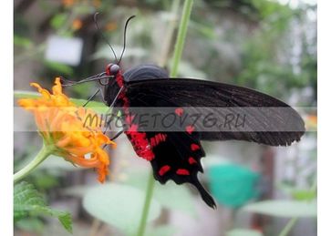 Размах крыльев 9-12 см. Фоновый цвет удлиненных крыльев бархатисто-черный с легким зеленоватым отблеском. Задние крылья на исподе обрамлены цепочкой из ярко-красных пятен. 800 Есть доставка.
