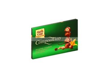 Alpen Gold Composition - ассорти конфет из молочного шоколада: • С цельным фундуком в кремовой начинке • С дробленым фундуком в кремовой начинке • С ванильной начинкой и воздушным рисом • С шоколадной начинкой со вкусом капуччино 800 Есть доставка.