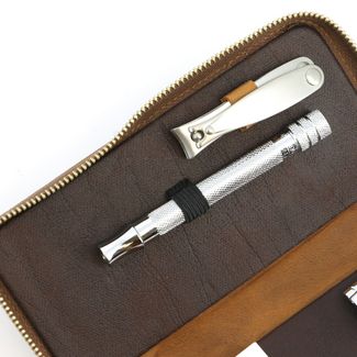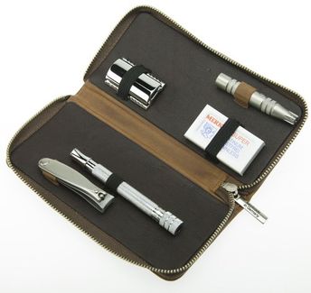 Набор бритвеный Dovo, 4 предмета. Состав: станок разбрный, лезвия, книпсер, триммер для удаления волос. Футляр: натуральная кожа (вол), цвет коричневый. Размер 16 x 2 x 8 см None Возможен самовывоз.
