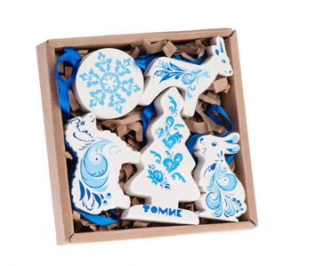 Набор елочных игрушек "Зимние узоры" сделан из натурального дерева и украшен яркой ажурной росписью. None
