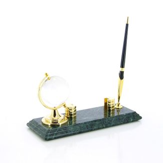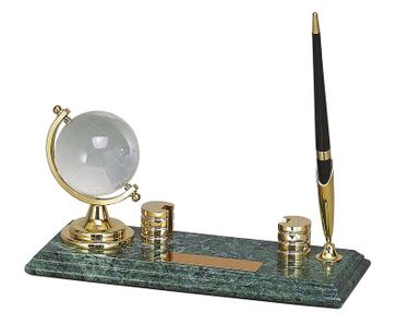 Настольный набор: глобус из стекла, ручка шариковая, цвет чернил - черный, держатель для визиток из алюминия, на мраморной подставке 23 х 9 х 1,8 см, мрамор None Возможен самовывоз.