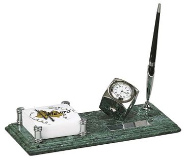 Настольный набор: держатель для блок-листов из меди, часы из меди, на мраморной подставке, 26 x 11 x1.8 см, мрамор None Возможен самовывоз.