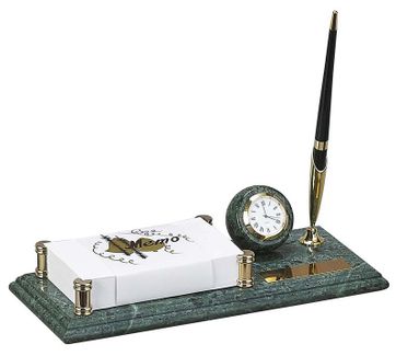 Настольный набор: держатель для блок-листов из меди, часы из меди, ручка шариковая, цвет чернил - черный, на мраморной подставке, 26 x 11 x1.8 см, мрамор None Возможен самовывоз.