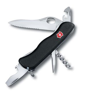 Перочинный нож NOMAD имеет 11 функций: 1. Фиксирующееся лезвие с серейторной заточкой и петлёй для открывания одной рукой 2. Штопор 3. Консервный нож с: 4. – Малой отвёрткой 5. Фиксирующаяся открывалка для бутылок с: 6. – Отвёрткой 7. – Инструментом для снятия изоляции 8. Шило, кернер 9. Кольцо для ключей 10. Пинцет 11. Зубочистка Цвет рукояти: чёрный Рекомендуемые чехлы: 4.0822.L, 4.0482.1, 4.0482.3, 4.0822.4, 4.0547, 4.0547.3, 4.0537 Рекомендуемые аксессуары: Инструмент для... None Возможен самовывоз.