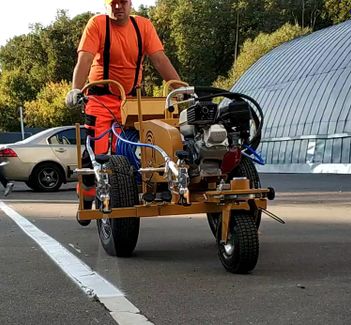 При этом у РМ 4-хтактный бензиновый двигатель с расходом топлива в 0,5 л/час. Это значит, что «Михалыч» экономично тратит ресурсы, а бак на 3,6 л позволяет ему наносить разметку 7 часов без остановки – практически целую рабочую смену.
