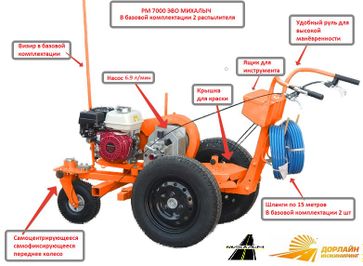 Разметочная машина РМ-7000 ЭВО «Михалыч» обладает внушительными техническими и качественными характеристиками. Для быстрой и качественной работы он оснащен: