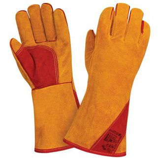 Перчатки выполнены из цельного спилка, пятипалые, с подкладкой из специального комфортного искусственого меха желто-золотого цвета 600 г/м2 Siberia, длиной 350 мм (+10/-5мм). Спилок КРС специально отобранный для серии Siberia - только спинная часть шкур прошедших предварительный отбор, спилок однородный, сорт АВ (1,3+/– 0,2 мм), шлифованный, желтого (золотого) цвета. Швы — оригинальная нить Кевлар, усилены вставками из кожи, на ладонной части и большом пальце дополнительный слой из спилка красного цвета.