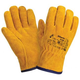 Перчатки защитные спилковые Siberia утеплённые предназначены для защиты от механических воздействий и пониженных температур. Выполнены из цельного спилка с подкладкой из искусственного меха белого цвета, длина 270 мм. Спилок КРС специально отбираемый для серии Siberia - только спинная часть шкур, прошедших предварительный отбор, спилок однородный, сорт АВ (1,3+/– 0,2 мм), шлифованный, желтого (золотого) цвета. На запястье резинка, двойные швы.