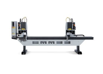 Предназначен для одновременной сварки двух углов ПВХ профиля под углами 40◦ -180◦ . Параметры температуры и времени плавления и сварки настраиваются независимо друг от друга. Предусмотрена возможность быстрой настройки челюстей для сварки белого и ламинированного профилей. Имеется система контроля предустановленного давления во время работы станка. Для обеспечения безопасности оператора, верхние прижимные цилиндры, первоначально работают при низком давлении. Быстрый способ замены тефлона и сварочных цулаг снижает потери рабочего времени. Долговечные нагревательные элементы обеспечивают равномерное распределение тепла. Технические характеристики Габаритные размеры: L = 4100 мм W = 905/1745 мм H = 1800 мм Рабочее напряжение: 230 В 1L-N-PE 50/60 Гц 4 кВт Масса: 530 кг Рабочее давление и расход воздуха: 6-8 Bar 38 л/цикл Размеры свариваемых конструкций: Min = 400 мм Max = 3240 мм Размеры свариваемых профилей: Min Н = 40 мм Max Н = 180 мм Max W = 130 мм Дополнительные опции Цулаги Система прижима уплотнителя