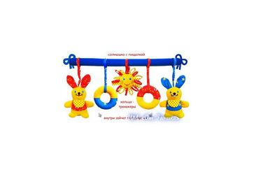 Описание: Два кольца — тренажёра, солнышко с пищалкой, два зайчика с погремушкой Кроха с большим интересом будет сосредотачивать свой взгляд на разных по величине и форме объектах этой мягкой подвески. Особенное удовольствие малыша вызовут веселые «персонажи» с контрастными улыбчивыми «личиками», а разные сочетания «теплых» и «холодных» цветов сделают рассматривание игрушек и «общение» с ними приятным и в яркий солнечный день, и в пасмурную погоду. Изготовлено из гипоаллергенных материалов. Производитель: Мякиши Размер 50х20см бесплатная доставка от 1000 руб.