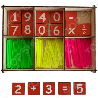 Набор счетных палочек PAREMO Веселый счет наглядное пособие для изучения основ арифметики. В комплект входят деревянные фишки с цифрами от 0 до 9 и математическими знаками, а также пластиковые счетные палочки 3 цветов. Все элементы набора размещаются в деревянном ящике с 6 секциями для удобного хранения. Комплект изготовлен из качественных материалов с безопасными красителями. Учимся считать Используя такой комплект, ребенок сможет выполнять простейшие арифметические действия самостоятельно. Выбирая нужные фишки, он будет выполнять примеры, составлять числа и сравнивать их, объединять цифры во множества. Знакомство с азами арифметики необходимо для общего развития и подготовки к школе. Выполнение простейших счетных операций развивает логическое мышление. Использование счетных материалов помогает в развитии мелкой моторики. None Возможен самовывоз. Есть доставка.