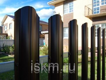 Предлагаем купить металлический круглый штакетник с двусторонним полимерным покрытием RAL 8017 коричневый ш. 120 мм. Доставка и установка в Ленинградской области. Низкие цены *Цена со скидкой указана при заказе от 500 м.п. штакетника (30-40 м.п забора). Цена указана без учета комплектующих (столбы, перекладины и т.д.) Возможные цвета: RAL 8017 Коричневый, RAL 5005 Синий, RAL 3005 Вишня, RAL 6005 Зеленый мох. Возможные длины: 1,5; 1,8 и 2 м. Металлический штакетник, или так называмый ЕВРОШТАКЕТНИК – это новинка в производстве уличных ограждений. Металлоштакетник изготавливается из рулонного оцинкованного металла с полимерным покрытием предназначенного для производства кровельных листов и профнастила. Металлический штакетник не горюч, и не нуждается в дополнительной защите от атмосферных воздействий, как например штакетник из дерева. Металлический штакетник легко и быстро монтируется с помощью цветных саморезов по металлу или заклепок. Режется с помощью ножниц по металлу («болгарка» сожжет защитный слой в месте среза) Цвет планок и высоту ограждения Вы выбираете по своему желанию. Можно комбинировать различные варианты забора: лицевую торону участка огородить металлоштакетником, из него же сделать калитку и ворота, а остальные стороны забора – из профнастила в цвет. Таким образом можно удешивить стоимость забора без существенного уменьшения качества и престижности забора. Преимущества забора из металлоштакетника: Выполнен из стали с защитным полимерным покрыт