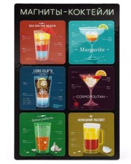 Набор магнитов Melompo Cocktail с рецептами известных коктейлей. Выполнены из высококачественного материала, декорированы схематическими рисунками в виде рецептов с точной дозировкой. Магниты квадратной формы, крупных размеров. В набор входят четыре магнита с рецептами алкогольных коктейлей и два с похмельными. Минимальная сумма заказа 1500 руб. Возможен самовывоз. Есть доставка.