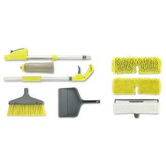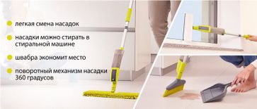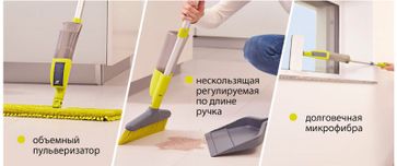 Настоящая система очистки для вашего дома! Мульти-Уборщик 5 в 1 С помощью многофункционального уборщика вы сможете вымыть окна, привести в порядок любые гладкие поверхности в доме и обеспечить своим близким максимум комфорта. Больше не нужно таскать с собой по всему дому ведро с водой. Теперь вы будете использовать удобный распылитель, благодаря которому любое моющее средство будет равномерно распределяться по поверхности и использоваться максимально экономно. Насадки в комплекте можно легко менять, а также стирать их в машинке. С помощью насадки-метлы вы сможете быстро удалить весь мусор с пола и переместить его на совок со специальными бортиками. Далее можно приступить к влажной уборке. В алюминиевой ручке расположен бак для воды или моющего средства. Ваша задача – намочить пол, используя распылитель и приступить к влажной уборке. Насадка имеет две стороны. Первая – из микрофибры, используется для очистки поверхности от пыли и грязи. А вторая сторона, из сверхплотного материала, удалит даже самые стойкие загрязнения. После влажной уборки вы сможете добиться кристальной чистоты на окнах. Совершенно необязательно использовать табуреты или стремянки, чтобы добраться до верха окон, поскольку уборщик имеет насадку с длинной рукояткой. Сначала вам нужно побрызгать на окно моющим раствором, затем – обработать поверхность валиком и смахнуть пену скребком для стекла (в комплекте). Точно таким же образом можно очистить зеркала и любые поверхности в доме. Главное – выполнение всех этих процедур не заставит вас потратить уйму времени. А после уборки у вас останется много сил и хорошее настроение, потому вы сможете насладиться отдыхом с семьей. Благодаря мультиуборщику 5в1, вы раз и навсегда забудете о временах, когда приходилось выделять на уборку весь выходной день, страдать от боли в спине или пояснице, а также разочаровываться из-за того, что результат был не таким, как ожидания. Спешите купить грамотного помощн