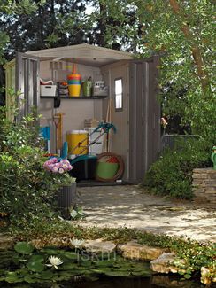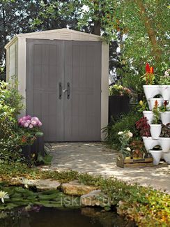 Стильный компактный сарай из пластика от компании KETER может быть использован в различных целях ― от хранения инвентаря до бытовки или душевой.