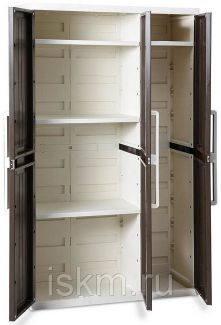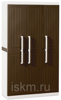 Шкаф 3-х дверный Wood Line S Размеры: длина - 97, ширина - 37, высота - 165 см. Цвет: корпус - молочно белый, двери - коричневые. Размеры в упаковке: 65 x 37 x 85 см. Материал изделия: пластик. Макс.нагрузка на полку: до 20 кг. Предназначен: для уличного хранения: хоз.инвентаря, садовых инструментов и пр. для домашнего хранения: овощей, солений, хозяйственного инвентаря и пр., для производств: хранение архивных документов, оборудования и пр., для гаражного и подвального хранения: запчастей, инструментов и пр. Вес изделия: 17,96 кг. Объем: 0,16703 м3.<