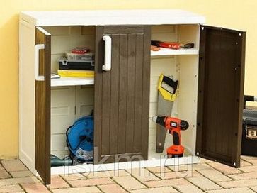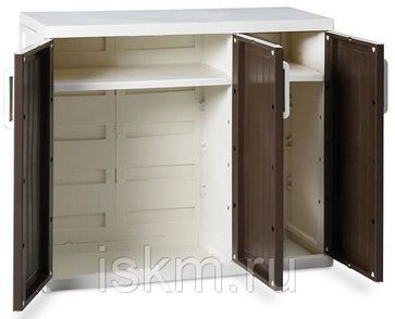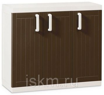 Тумба 3-х дверная Wood Line S Размеры: длина - 97, ширина - 37, высота - 85 см. Цвет: корпус - молочно белый, двери - коричневые. Размеры в упаковке: 65 x 37 x 85 см. Материал изделия: пластик. Макс.нагрузка на полку: до 20 кг. Предназначена: для уличного хранения: хоз.инвентаря, садовых инструментов и пр. для домашнего хранения: овощей, солений, хозяйственного инвентаря и пр., для производств: хранение архивных документов, оборудования и пр., для гаражного и подвального хранения: запчастей, инструментов и пр. Вес изделия: 9,89 кг. Объем: 0,1067 м3.