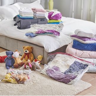 Если ваши шкафы забиты вещами и вам катастрофически не хватает места, чтобы сложить все компактно и аккуратно, то набор вакуумных пакетов с клапаном для хранения вещей Dormeo XXL быстро решит вашу проблему. Четыре вакуумных пакета изготовлены из плотного полиэтилена, оснащены двойной застежкой и клапаном для удаления воздуха. Прозрачный полиэтилен позволяет быстро находить нужную вещь. Набор поможет оптимизировать пространство в вашем доме и защитит любимые вещи от насекомых, влаги, плесени, неприятного запаха, пыли и грязи. Экономьте до 80 свободного места! Вакуумные, прочные, влагонепроницаемые, многоразовые Если вы заботитесь о том, чтобы сохранить как можно больше свободного места, то вакуумные пакеты Dormeo незаменимая вещь. В наборе вы получаете четыре прочных, влагонепроницаемых вакуумных пакета с клапаном и двойной застежкой: 2х пакета XL 55х86 см , 2х пакета 3D 100х60х47 см . Эти удобные пакеты специально разработаны для бережного хранения одеял и подушек, домашнего текстиля, пуховиков, курток, свитеров, сезонной детской одежды. С их помощью габаритные вещи займут в несколько раз меньше места, а на ваших полках будет царить идеальный порядок. Экономьте до 80 свободного места! Механическая прочность материала, конструкция замка и клапана позволяют использовать вакуумные пакеты Dormeo многократно, доставая из них одежду или текстиль по мере надобности. Благодаря прозрачному полиэтилену вы легко ориентируетесь в содержимом и быстро находите нужную вещь. Вакуум сохранит ваши вещи в идеальном состоянии Принцип работы основан на свойствах вакуума безвоздушного пространства. Снижая в закрытом пакете давление, вы создаете среду, в которой замедляются процессы окисления, уменьшается теплопроводность и влагопоглощение, исчезают условия для жизни живых организмов. Поэтому вакуумные пакеты Dormeo эффективны для защиты вещей от насекомых, влаги, грязи и пыли, неприятных запахов, плесени. Для откачивания воздуха не нужно приобретать какие-либо дополнительные приспособл