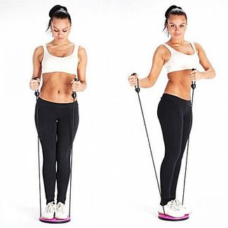 Перед тренировкой необходимо выпить 1 стакан теплой воды для того, чтобы улучшить кровообращение; Стоя, вращайтесь на диске. Будут активно работать талия и ягодицы. А если вы немного согнете ноги в коленях, то также добавится напряжение на икроножные мышцы и бедра. Работайте эспандерами руками, сгибая и разгибая локти (плотно прижав их к корпусу); Вращайте диск руками, держа его перед собой на вытянутых руках. Работают мышцы груди, рук и живота; Станьте ногам на диск лицом к стулу и держитесь за спинку. Вращайтесь влево и вправо, н