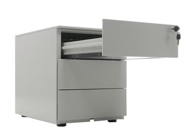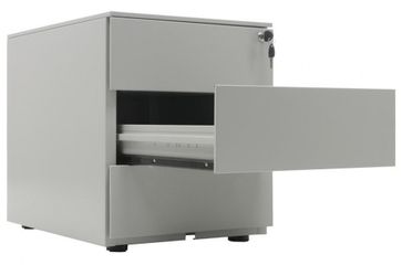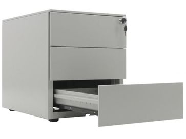 Жесткий сварной корпус, П-образной формы Три типоразмера ящиков: файловые, канцелярский и канцелярский уменьшенный Файловые ящики оборудованы телескопическими направляющими, обеспечивают свободный и плавный ход ящиков даже при полной загрузке, позволяют выдвигать ящик на всю длину и использовать 100% пространства Канцелярские ящики имеют роликовые направляющие, не полное выдвижение Габариты файловых ящиков специально рассчитаны для хранения подвесных папок формата А4 и формата foolscap (в комплекте планка для подвеса папок) или папок «Корона», канцелярские ящики идеально подходят для хранения офисных и личных вещей Антиопрокидывающее устройство, не позволяющее одновременно выдвигать более чем один ящик Центральный ключевой замок «Практик» (2000 комбинаций) Нагрузка на ящики для канцелярских принадлежностей – 10 кг, на нижние файловые – 25 кг (в основании файлового ящика установлено колесо, увеличивающее грузоподъёмность) Возможность установки на выравнивающие опоры или колеса Возможность окраски в RAL-9005 (муар) Возможна поставка готовых каркасов тумб (без топа и лицевых панелей) Поставляются в собранном виде Опции: пластиковые лотки и металлический ящик для канцелярских принадлежностей и других предметов. Возможность комбинирования цветов: корпус + фасады ящиков и крышка (конструкция тумбы металл+металл). Или отделка фасадов ящиков и крыши тумбы ламинированной плитой ЛДСП Цвет: RAL-7035 (светло-серый) Тип покрытия: порошковое 3 ящика None