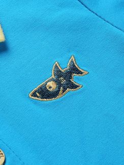 Поло Sweet Berry Акула голубое изготовлено из трикотажа и декорировано нагрудной вышивкой и принтом на спинке. На воротничке по краю контрастная полоска. Застёжка на три пуговицы. В боковых швах снизу разрезы. Минимальная сумма заказа 1500 руб. Возможен самовывоз. Есть доставка.
