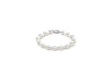 Красоту каждой белоснежной жемчужины подчеркивают круглые вставки из серебра. Браслет выполнен из пресноводного жемчуга. None