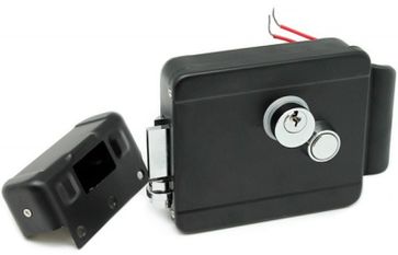 Замок FASS F-2369I накладной в корпусе чёрного цвета, электромеханический, универсальный (дверь наружу, внутрь), ролик взвода пружины, блокировка ключом кнопки выхода, 12В.