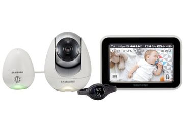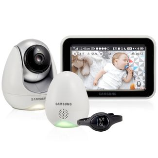 В комплектацию данной модели входит датчик условий окружающей среды (температура, влажность, качество воздуха) и наручные часы, которые при возникновении звука в детской комнате уведомляют родителей с помощью вибросигнала. Видеоняня от известного производителя Samsung SEW-3057WP сочетает в себе два режима связи: FHSS и Wi-Fi. Первый обеспечивает надёжную прямую связь между родительским и детским блоками на расстоянии до 300 метров, а возможность подключения устройства к домашней беспроводной сети Wi-Fi позволяет наблюдать за ребенком из любой точки планеты при помощи го приложения для смартфона или планшета (iOS или None